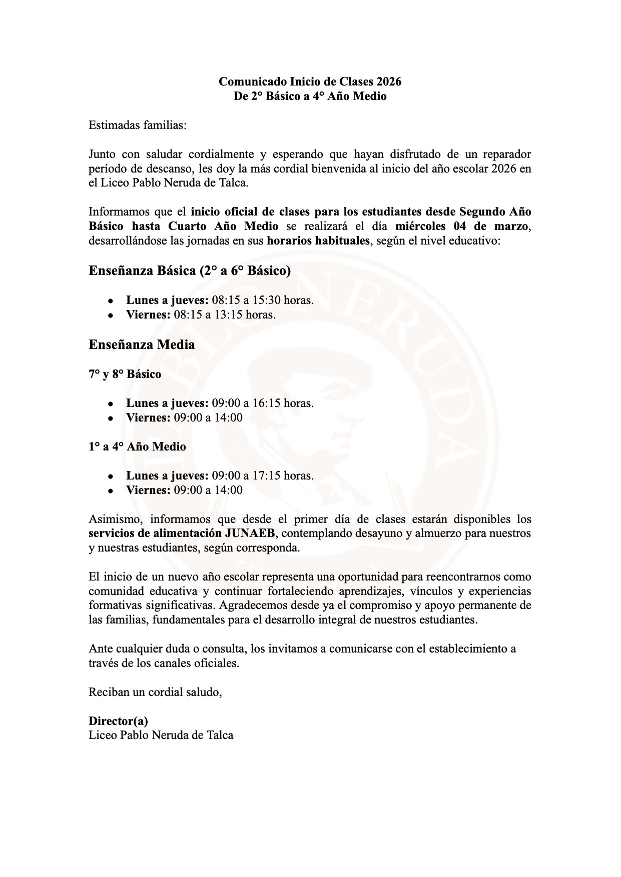 Comunicado a Familias de 1° Año Básico – Año Escolar 2026