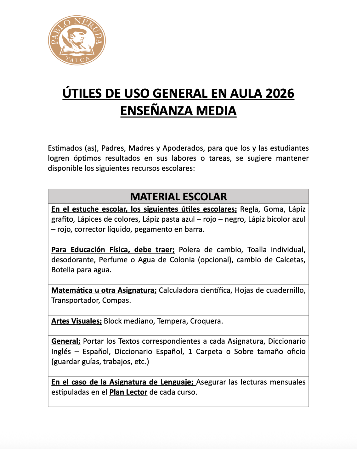 útiles de uso general enseñanza media 2026 Dirección 8 Calendario de evaluaciones enseñanza media primer semestre 6 Abr, 2026 Dirección Plan Lector Media 2026 30 Mar, 2026 Dirección FIESTAS PATRIAS 2025 30 Mar, 2026 Dirección